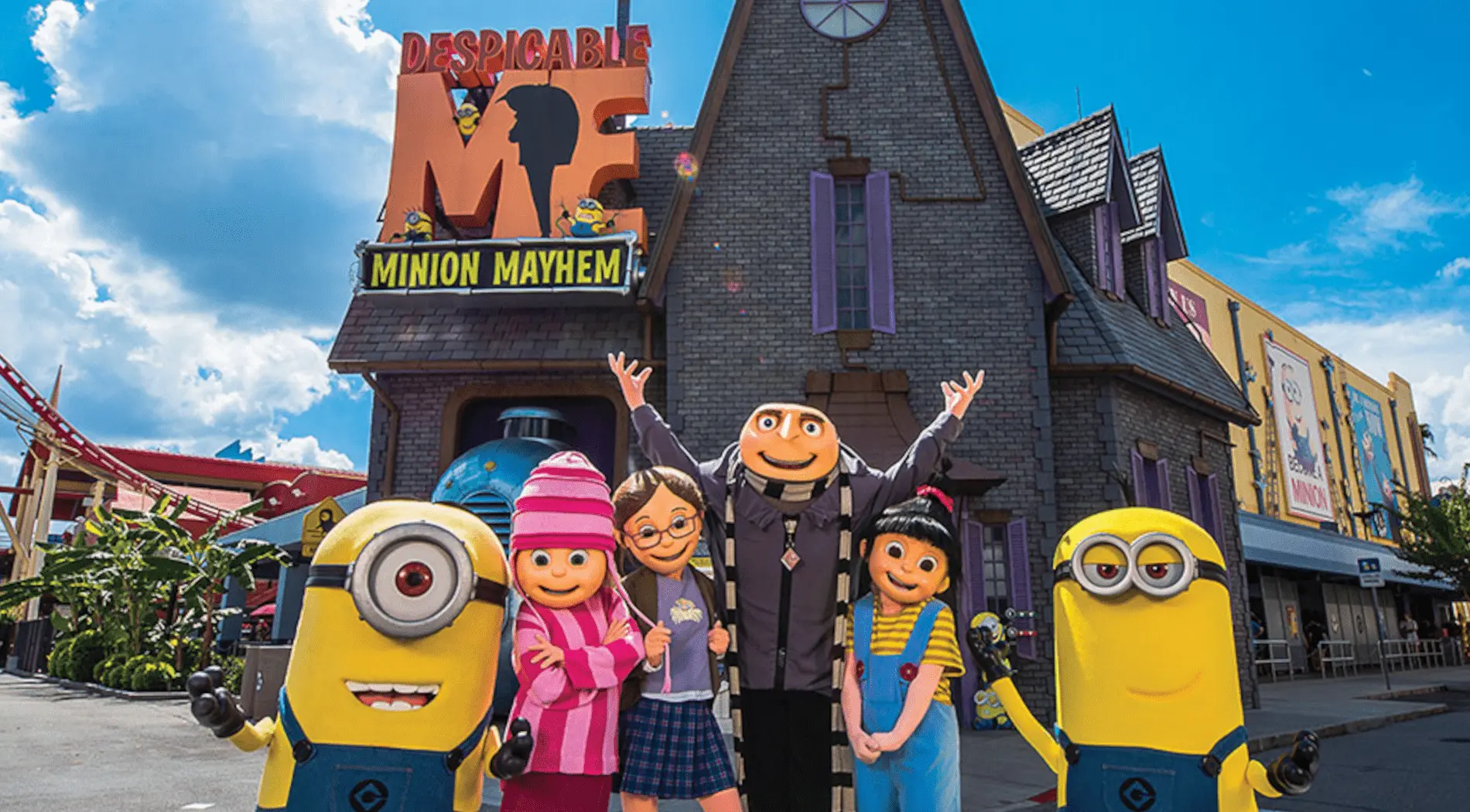 En el parque de Universal Studios Orlando ya se cuenta con una atracción de estos personajes, se trata de Minion Mayhem. Aquí se entra haciendo fila por la casa de Gru, donde las decoraciones brindan bastante información sobre el reclutamiento de Minions a los visitantes. Además, se pueden explorar cuartos como la sala y el laboratorio antes de llegar a la experiencia principal.